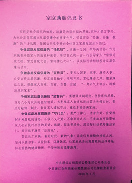 為充分發(fā)揮員工家庭成員在黨風(fēng)廉政建設(shè)中監(jiān)督預(yù)防的特殊作用,根據(jù)集團(tuán)“廉政教育月”活動要求,5月30日,監(jiān)察室向全體員工發(fā)放了一封以“傳承好家風(fēng),共建廉之家”為內(nèi)容的《家庭助廉倡議書》,讓廉潔文化走進(jìn)家庭,成為家庭美德,更好地發(fā)揮家庭成員在廉政建設(shè)中的特色作用。