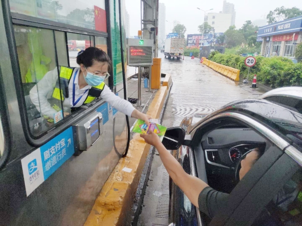 圖為收費員向過往司乘發(fā)放宣傳單