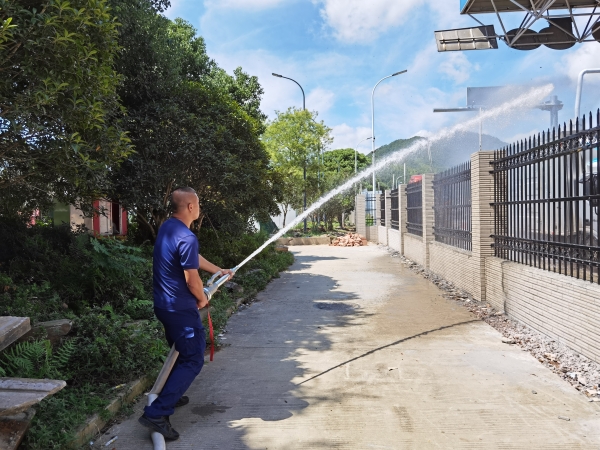 圖為消防官兵用高壓水槍沖洗被蜜蜂占領的區域 可是,蜜蜂不除去,車道無法安全通行,所里電話求助消防官兵。消防官兵采用高壓水槍沖洗被蜜蜂占領的區域,行政人員便配合他們再次利用殺蟲劑噴殺四處飛舞的蜜蜂,尤其是它們的“老巢”。前后經過半小時的努力,數千只蜜蜂終于被成功驅散,被侵占的車道重新開啟。