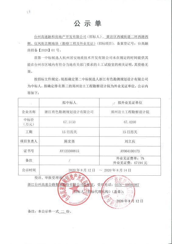 黃巖二環西路西側、儀風街北側地塊(勘察工程及外業見證)中標公示